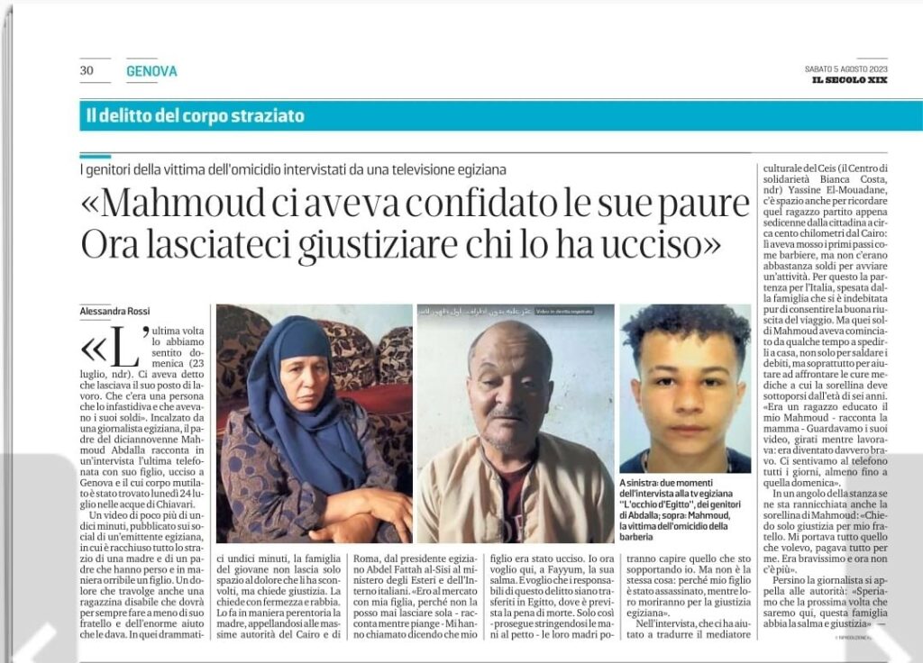 I Genitori della vittima intervistati da una televisione egiziana e aiutati nella traduzioni da un mediatore culturale del CEIS Genova,