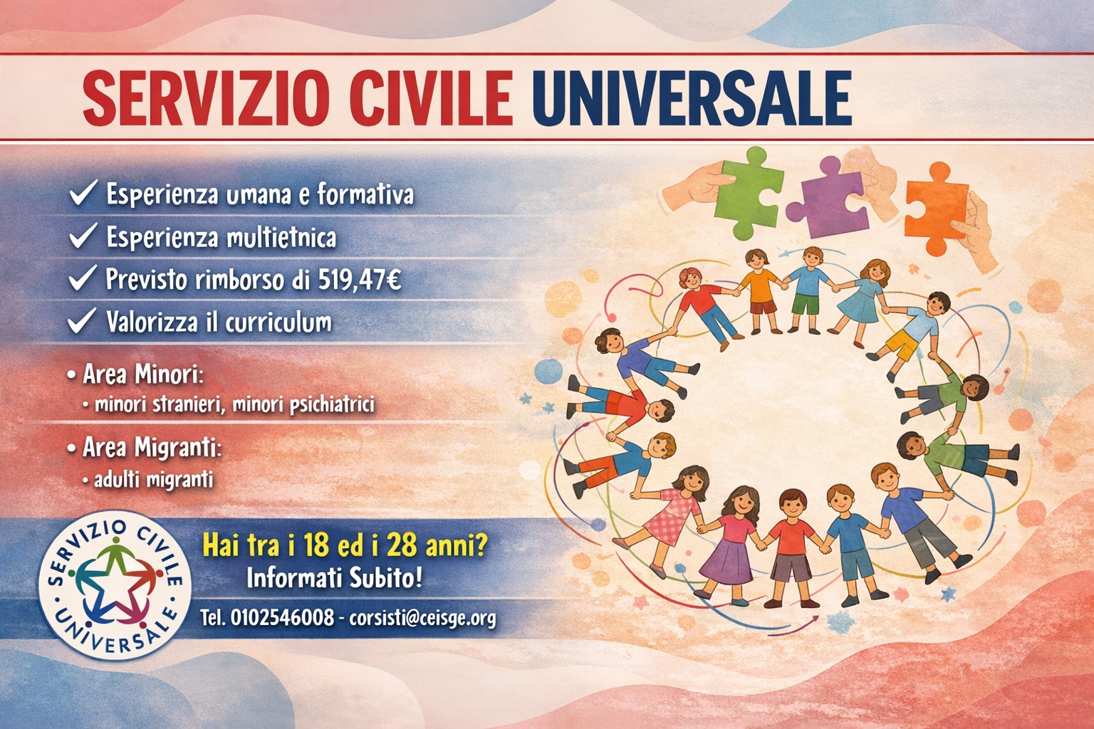 Nel 2025 partiranno 3 progetti di servizio civile Universale del CEIS Genova per 25 posti complessivi di impiego nei nostri servizi verso le persone svantaggiate, in particolare tossicodipendenti, profughi richiedenti asilo e adolescenti con problematiche psichiatriche.