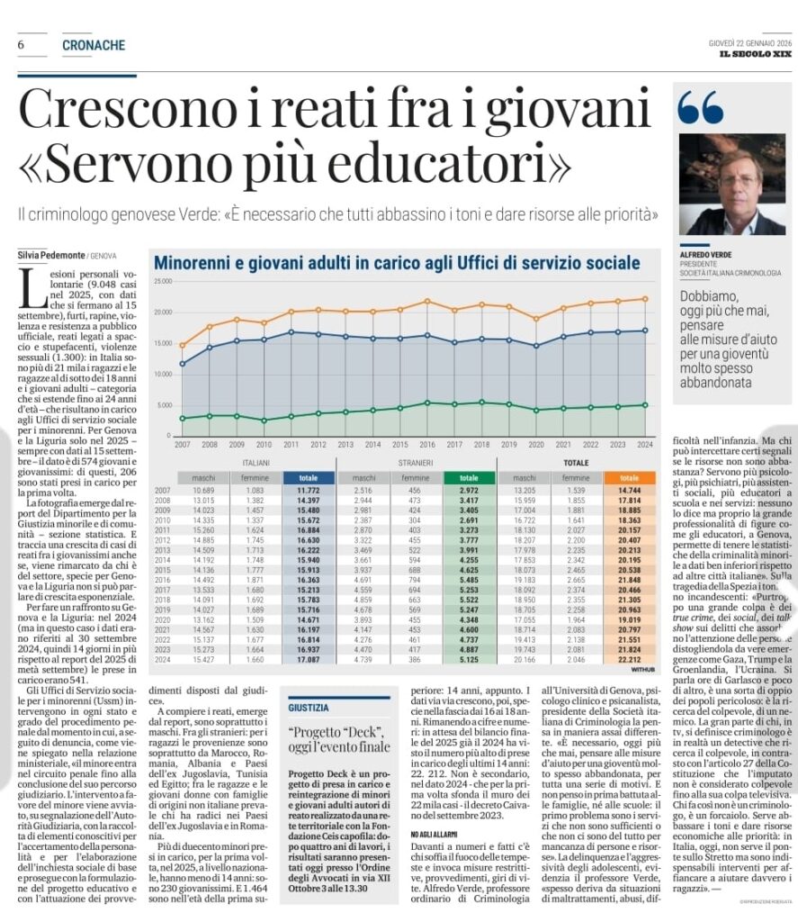 Il Secolo XIX – 22/01/2026 Crescono i reati fra i giovani: servono più educatori Relazioni Esterne2026-03-06T09:53:27+01:00 Condividi questa notizia, Scegli il tuo Social preferito! FacebookXLinkedInEmail Post correlati Il Secolo XIX – 10/01/2026 Galleria Il Secolo XIX – 10/01/2026 Il Secolo XIX – 17/01/2026 Galleria Il Secolo XIX – 17/01/2026 La Repubblica – 24/12/2025 Galleria La Repubblica – 24/12/2025 Il Secolo XIX – 7/12/2025 Galleria Il Secolo XIX – 7/12/2025 PRIMOCANALE- La trasmissione TI RICORDI? ricorda la Missione di Bianca Costa Bozzo, la Signora della Solidarietà Galleria PRIMOCANALE- La trasmissione TI RICORDI? ricorda la Missione di Bianca Costa Bozzo, la Signora della Solidarietà